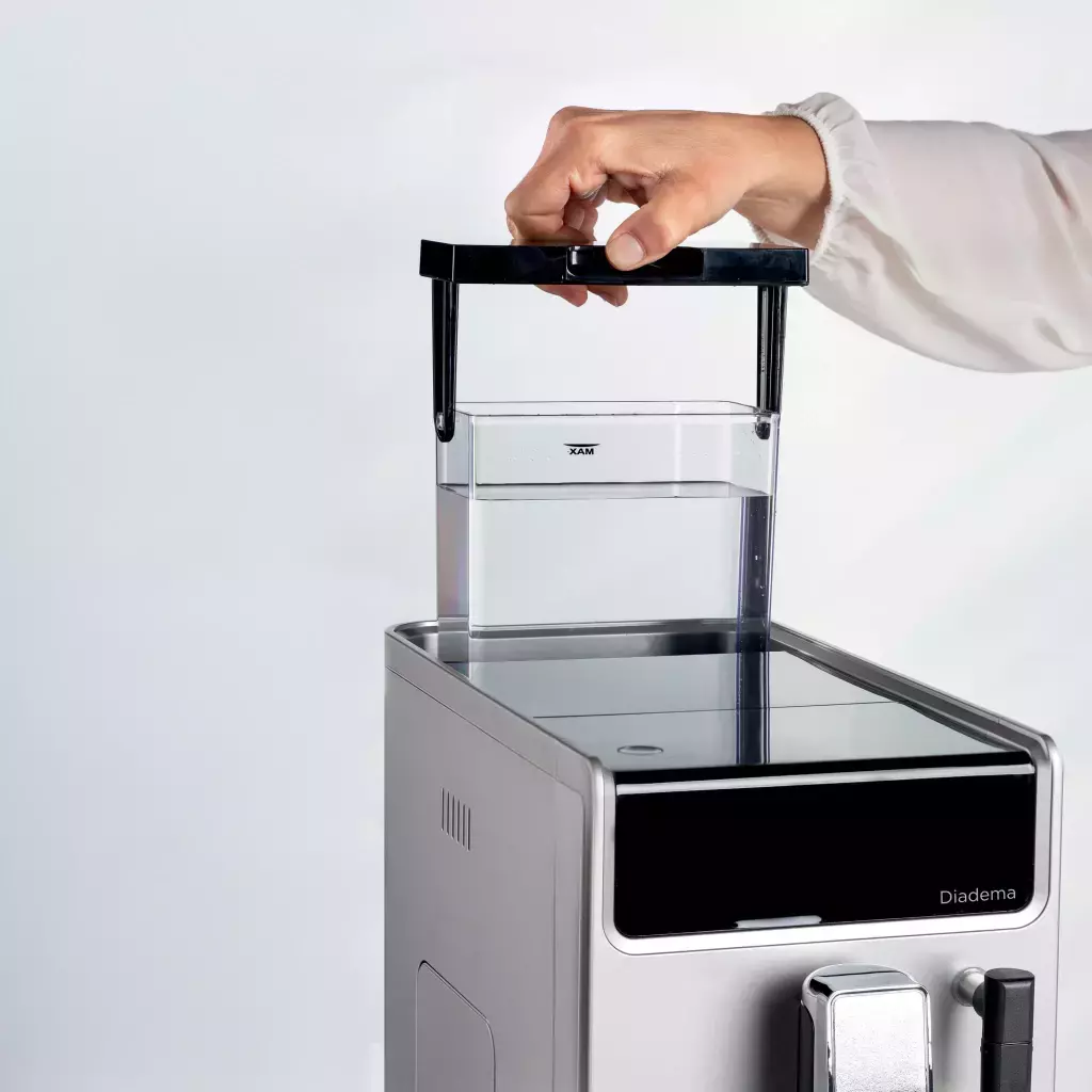 La cafetera automática Diadema Pro te permite preparar un café de calidad profesional en casa, con la facilidad de un solo clic. Su pantalla LED digital facilita la personalización de la bebida y su diseño de colores intensos y formas lineales aporta elegancia a la cocina.