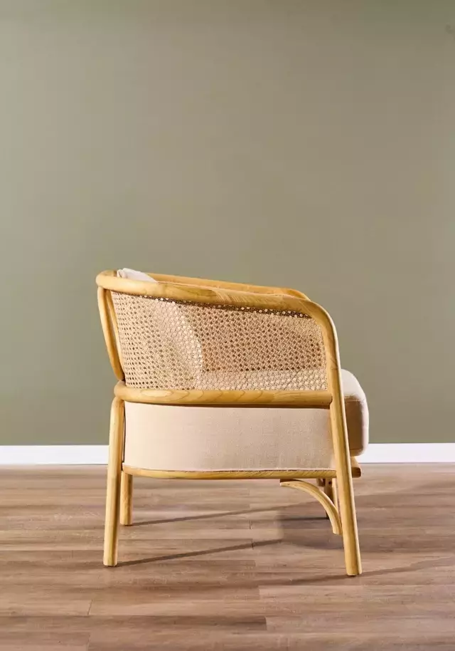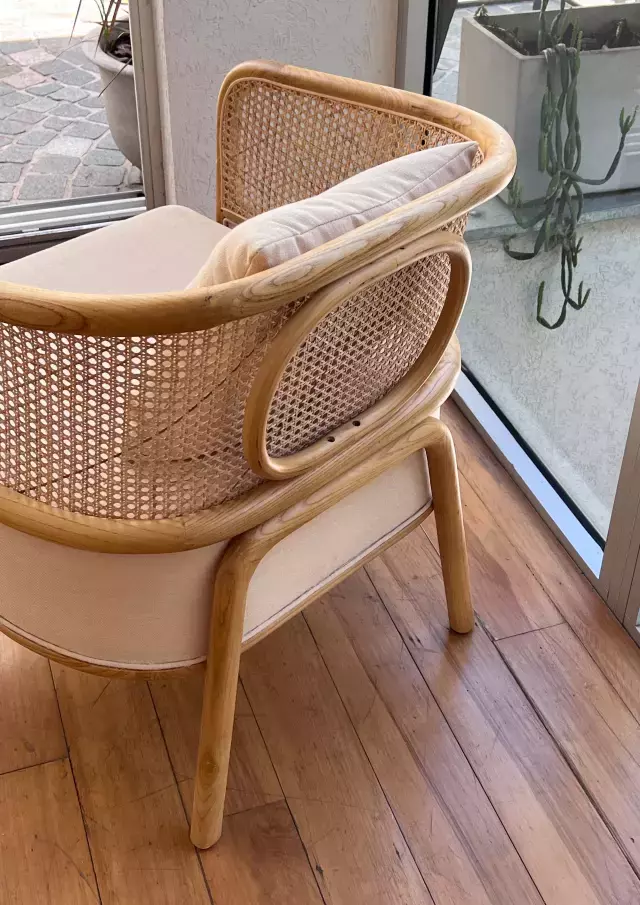 Poltrona de líneas curvas fabricada en madera olmo de lustre claro y esterilla natural. Posee un almohadon desmontable con cierre y otro de respaldo. Ambos tapizados en lino beige.