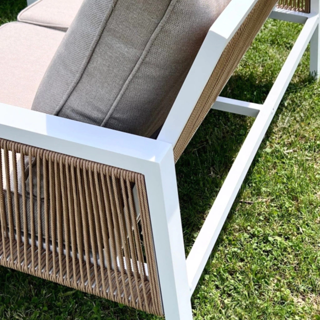 Conjunto de aluminio para exterior, compuesto por dos sillones individuales, un sillón de dos cuerpos y una mesa ratona. Tapizados con almohadones beige.