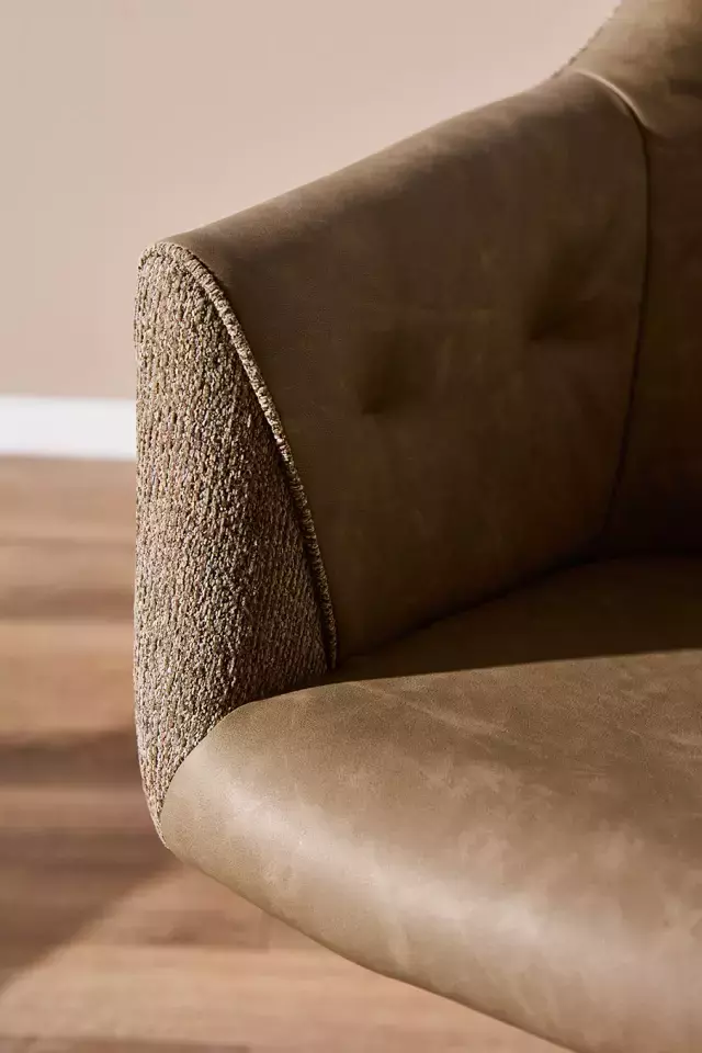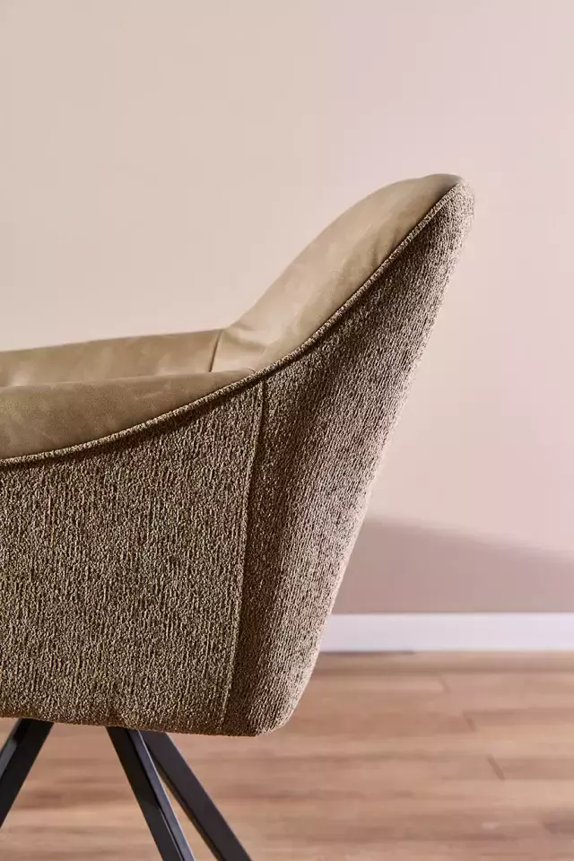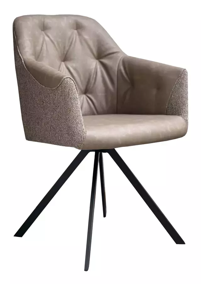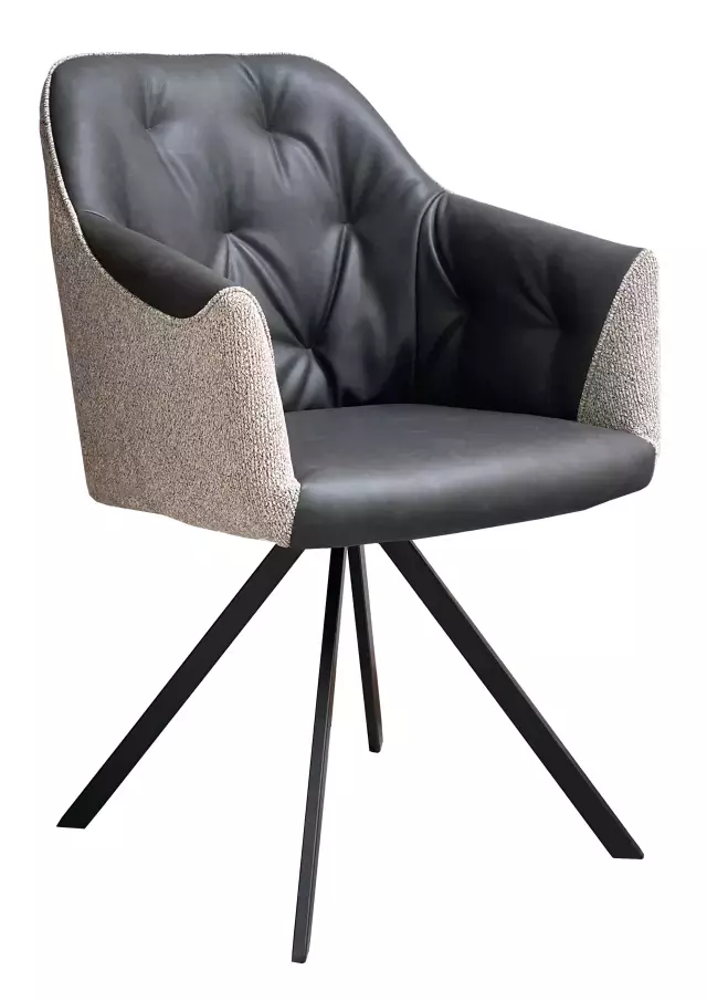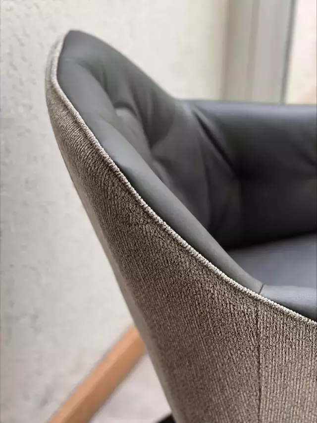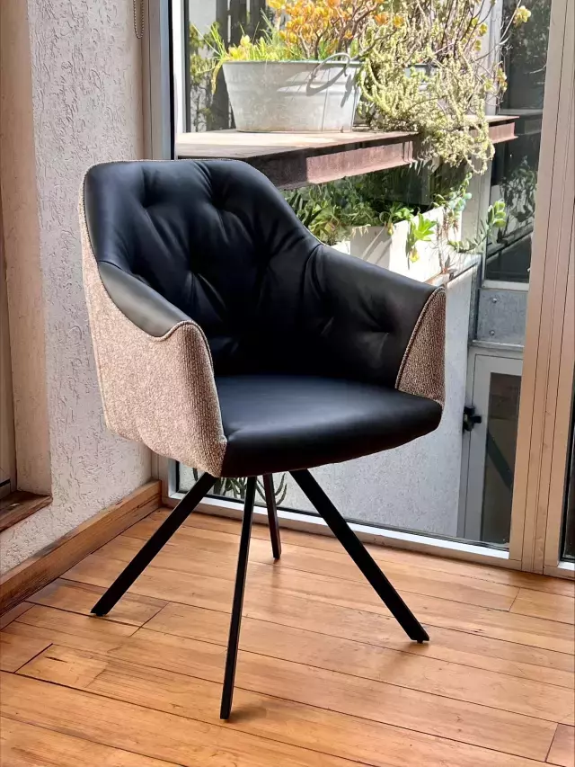 Silloncito de chenille y ecocuero con base de hierro negro, giratoria en 180 grados. Disponible en tapizado gris-ecocuero negro y tapizado vison-ecocuero vison.