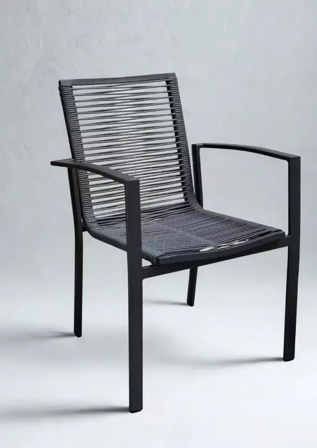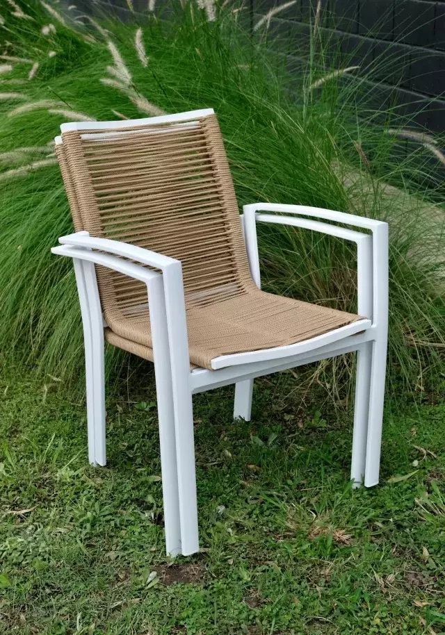 La Silla Sula combina una estructura de aluminio liviana y anticorrosiva con asiento y respaldo tramados en soga para exterior. Su silueta recta con apoyabrazos integrados aporta confort y un look limpio y contemporáneo, ideal para galerías, patios, quinchos y bares. Apilable para optimizar espacio.