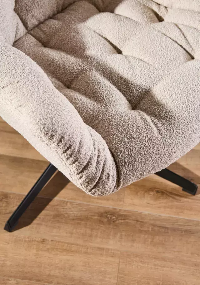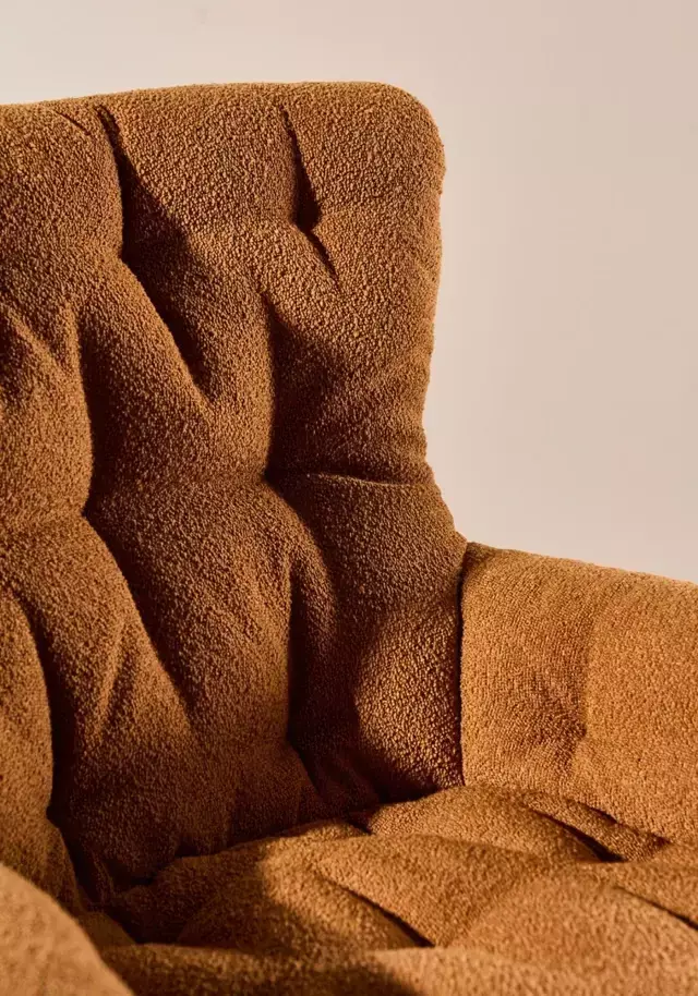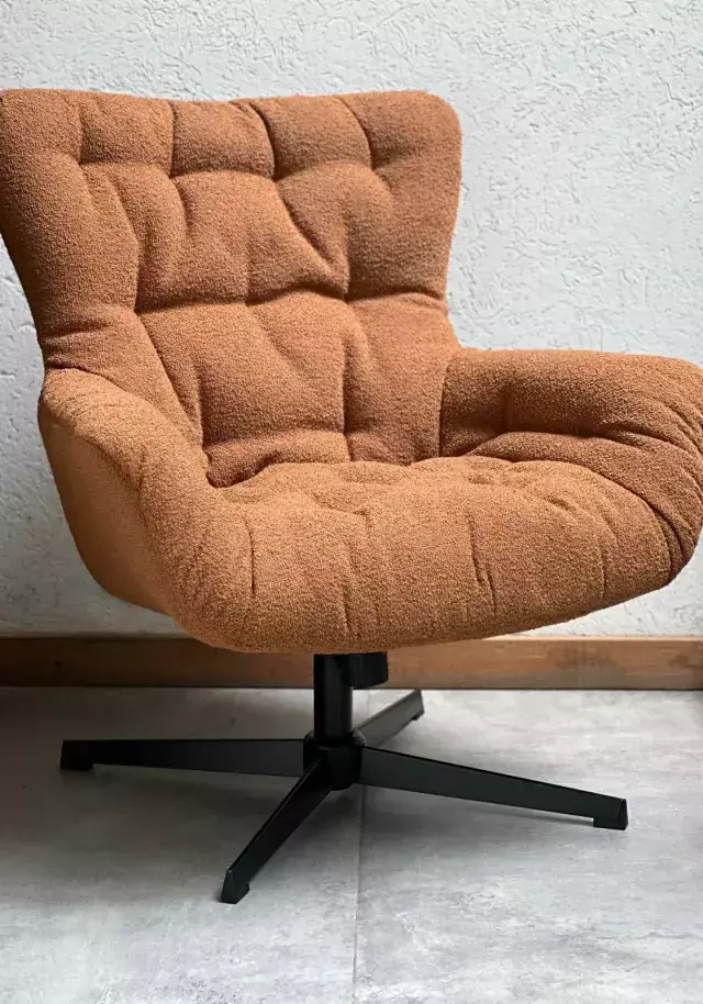 El Sillón Neptuno suma confort y presencia con su tapizado bouclé de textura suave y look actual. Incorpora base giratoria tipo estrella y respaldo reclinable, para pasar de la charla a la lectura o al descanso en un gesto. El asiento amplio y los apoyabrazos envolventes brindan soporte cómodo en livings, dormitorios u oficinas.