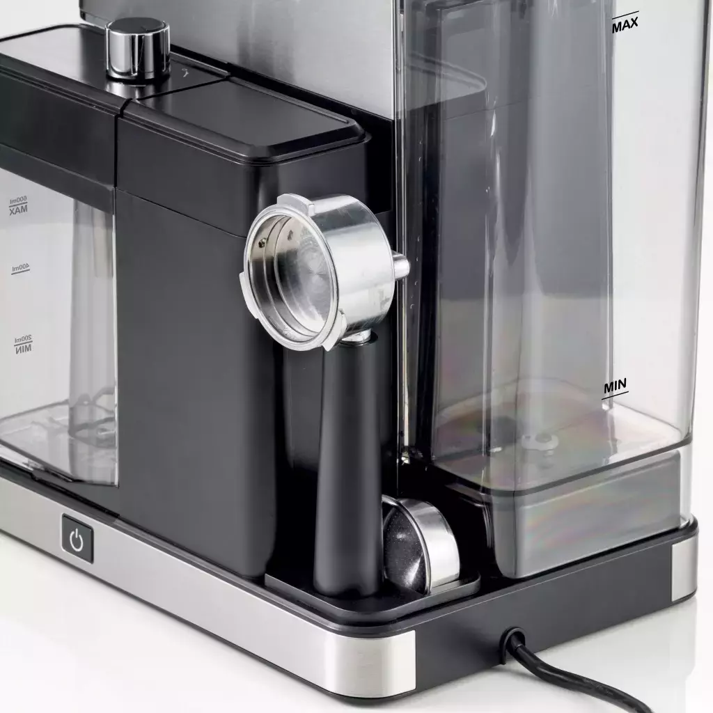 Compacta y moderna, esta cafetera permite preparar espresso o cappuccino como en la cafetería, incluso en espacios reducidos. Su elegante diseño incluye un práctico compartimento trasero para mantener todo ordenado.